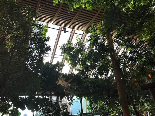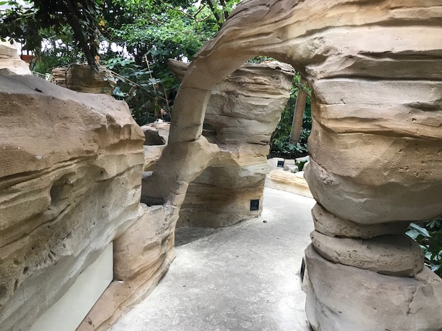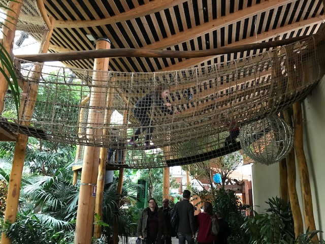 Sous le dôme, à côté de l’AquaMundo, il y a un grand espace avec plantes tropicales, grottes, chemins, aires de jeux, et des restaurants et boutiques.