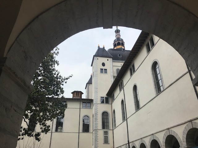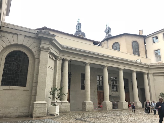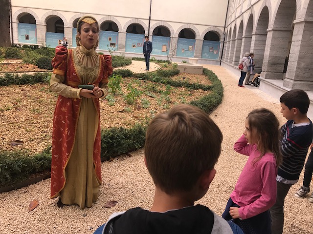 RDV était donné dans le cloître. Nous avons été accueillis par Louise Labé en personne (aussi appelée La Belle Cordière en raison du métier de son père qui était cordier – une rue porte d’ailleurs son nom près de l’Hôtel Dieu). Née en 1524, elle fût une poétesse célèbre pendant la Renaissance.